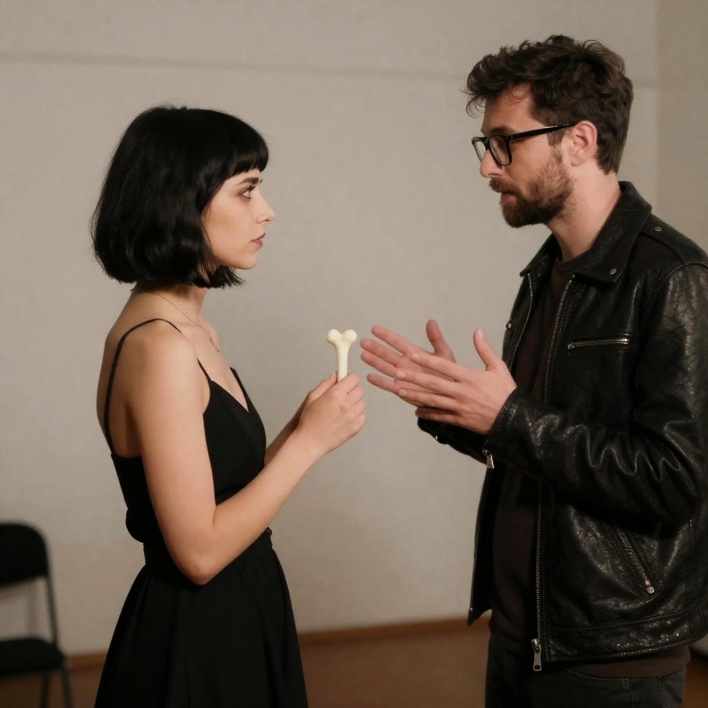 Photograph of a woman with a short black bob haircut and a black spaghetti strap dress holding bone-like objects, facing a man with glasses, beard, and leather jacket gesturing with his hands. Both are in a dimly lit room with a white wall in the background.