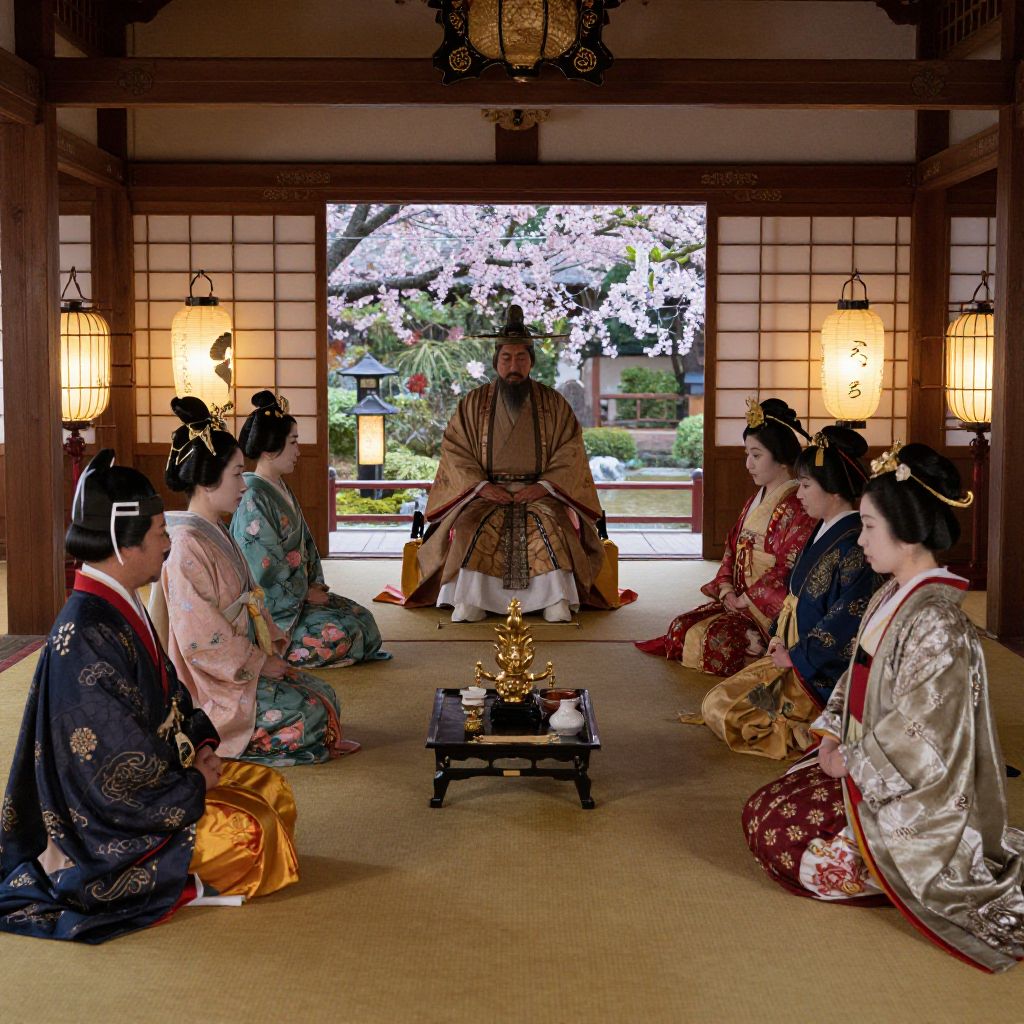 Japanese imperial court gathering, noblemen and ladies in classical Heian era dress, ornate hairpieces and accessories, ceremonial court rituals by the emperor, paper lanterns glowing, cherry blossoms in a palace garden visible through open shoji screens, refined and serene ambiance