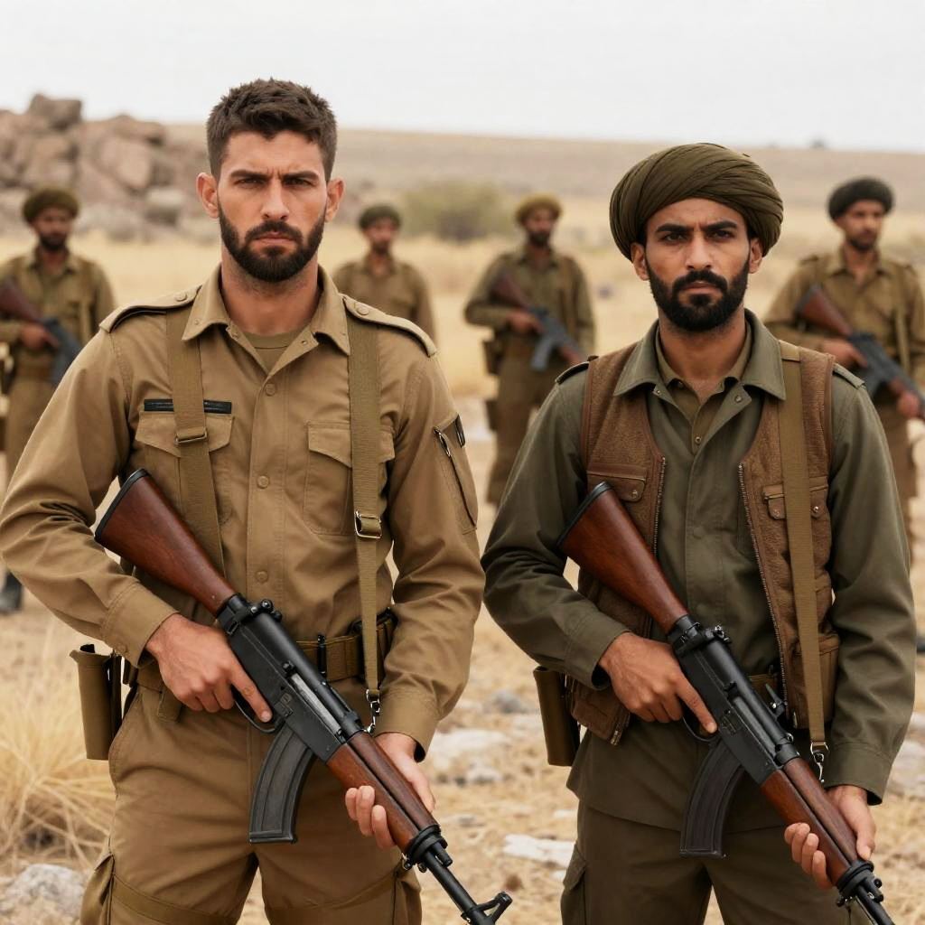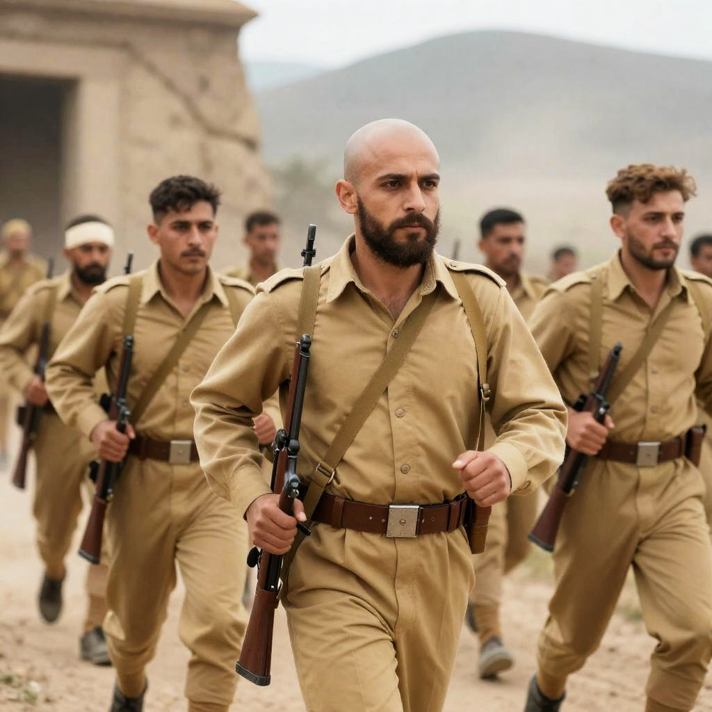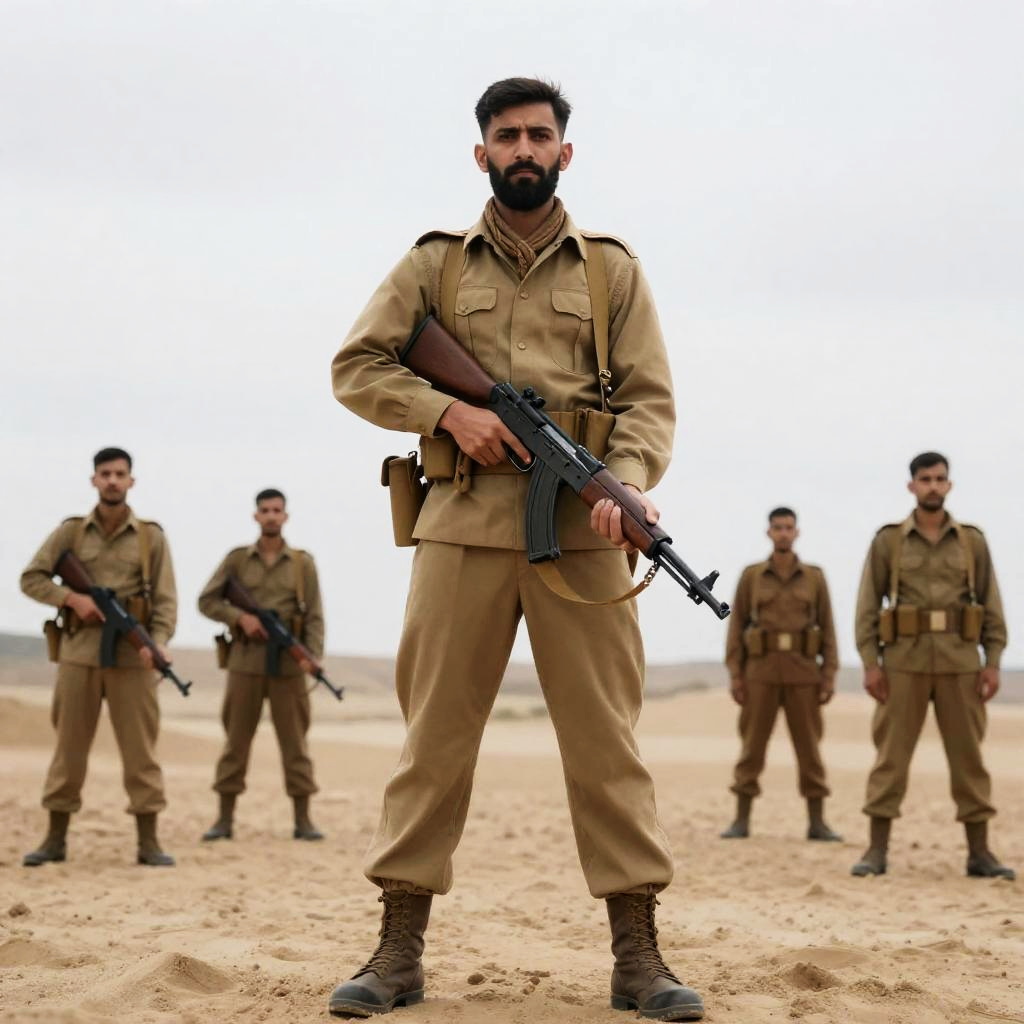Photograph of a bearded man in a beige military uniform with a scarf, holding a rifle in both hands, standing on a sandy hill. Six soldiers in the background, some standing, some walking. Overcast sky, light clouds. Intense expression. Sand ure, military gear visible.
