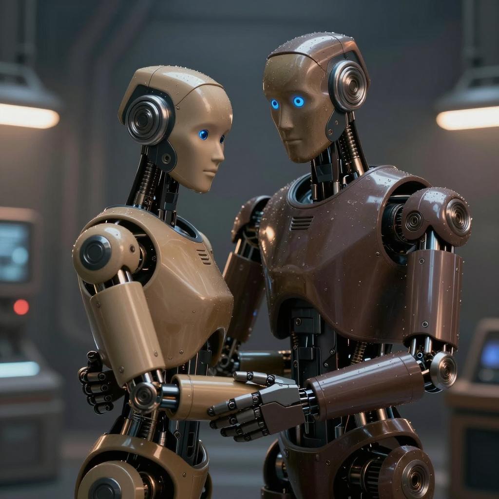 Two humanoid robots with metallic heads and brown mechanical bodies. One robot wears a dark shirt, hugging the other from behind. Both have neutral expressions. Background includes blurred lights and machinery. The hugging robot's right hand is extended forward. The scene has a sci-fi setting.
