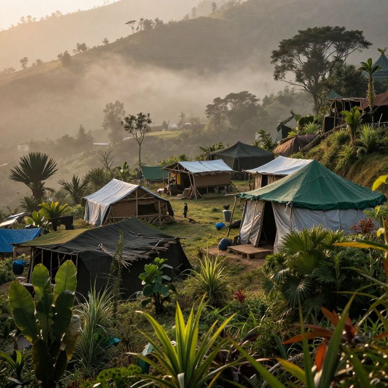 Photograph of a hillside encampment at sunrise, featuring multiple tents with various colors of roofs—green, white, and black—scattered among lush greenery. The tents are made of canvas and tarpaulin, with some having open sides. Mist rises from the valley, creating a hazy effect. Tall trees and shrubs, including palm-like plants, surround the tents. The background shows a gently sloping hill with more trees and a soft, golden morning light. The overall atmosphere is tranquil and rustic, with a sense of early morning stillness.