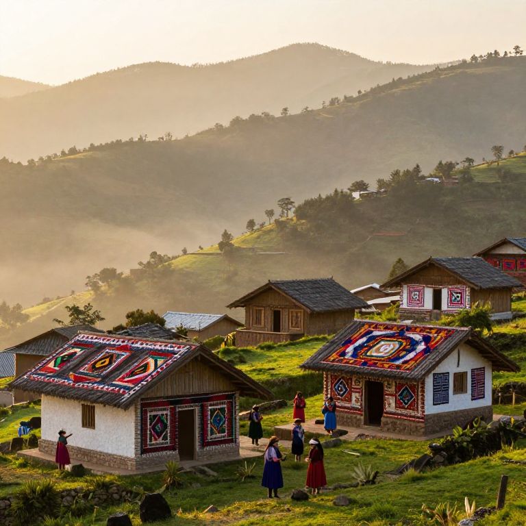 FARC rebel camp set in a remote mountainous area at dawn, rustic tents and makeshift structures surrounded by dense greenery, soft golden light filtering through fog, focus on local flora and the rugged survivalist lifestyle, photorealistic style.