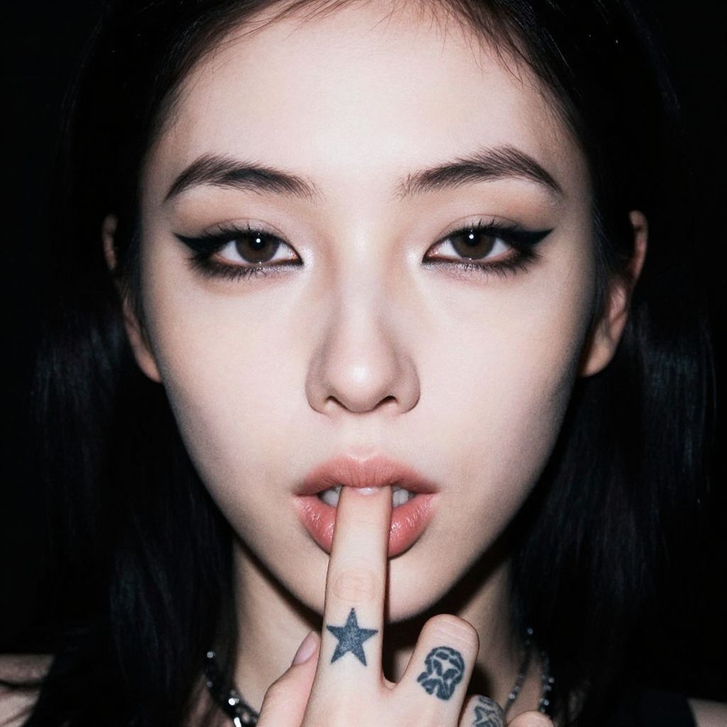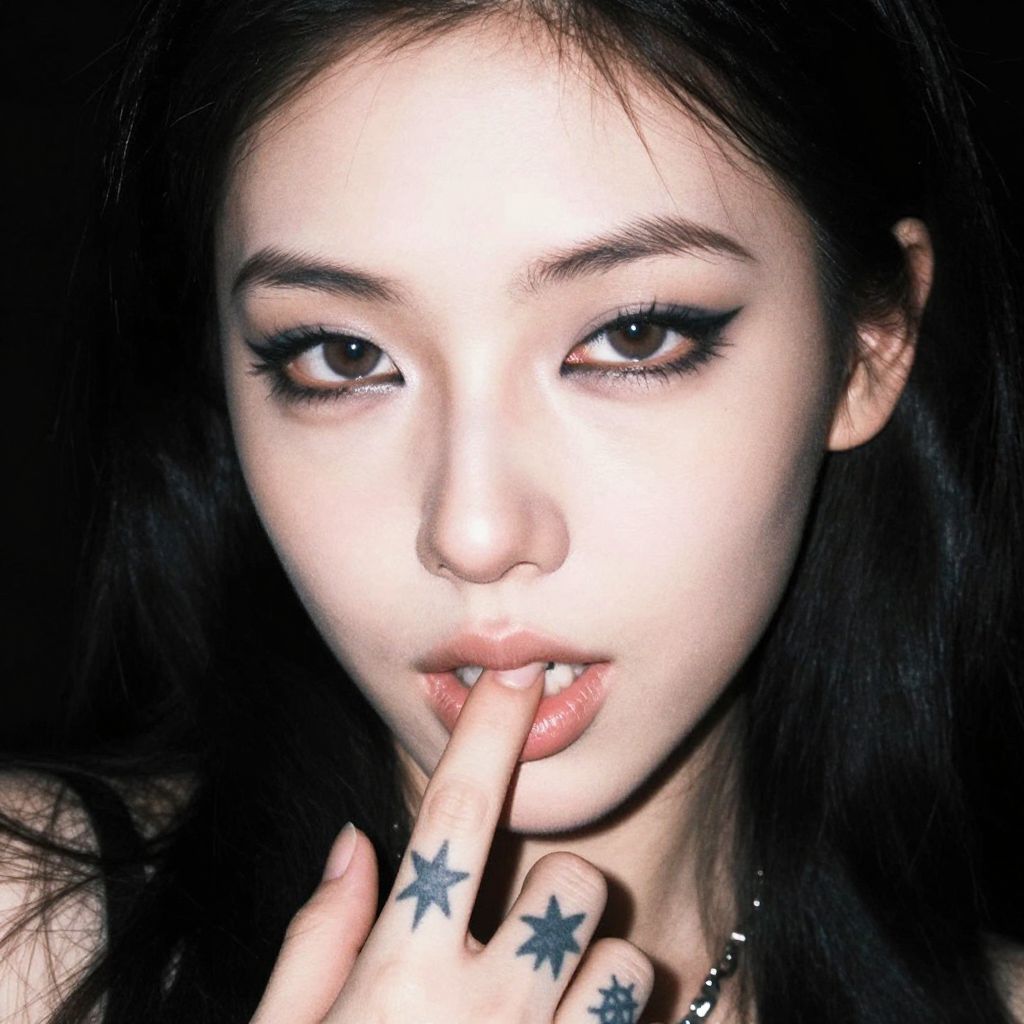 Close-up photograph of an Asian woman with dark hair, heavy black eyeliner, white skin, and tattoos on her fingers, biting her index finger with