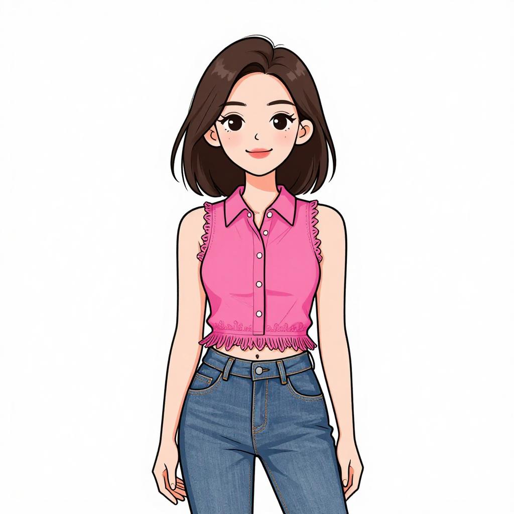 Woman with pretty face and pretty hair. smiling Woman, casual contemporary, light pink cardigan with floral embroidery, V-neck, scalloped edges, front button closures, denim mini skirt with floral embroidery along the hem, white lace trim, choker necklace with purple gemstone, white background. --sref 1467
