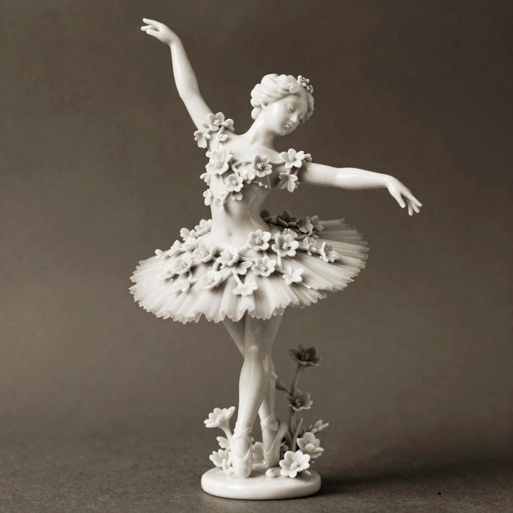 Black-and-white photograph of a detailed, white porcelain ballet statue wearing a floral tutu, with arms gracefully extended, set against a dark background.