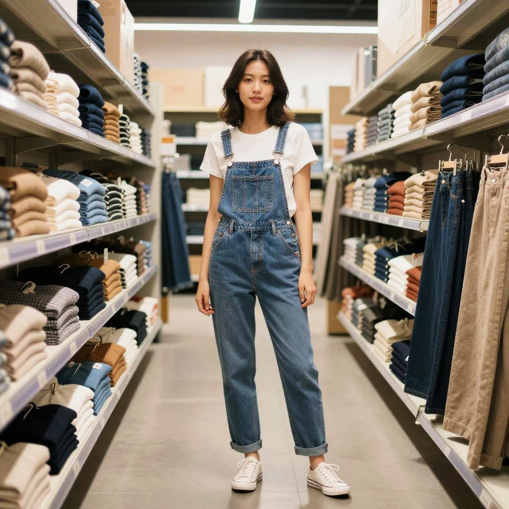 Trendy Work Wear, woman in overalls standing in a store aisle