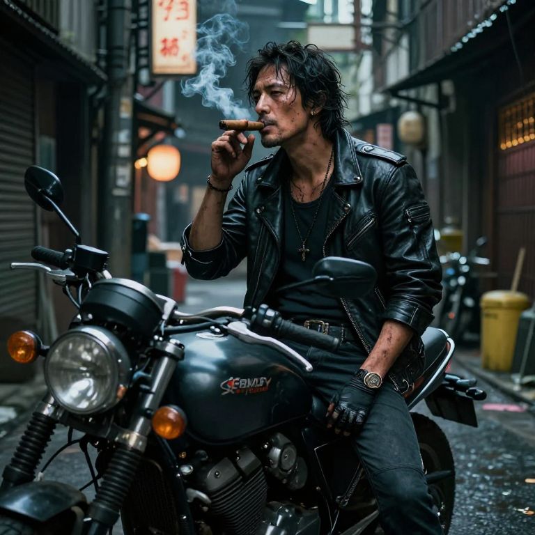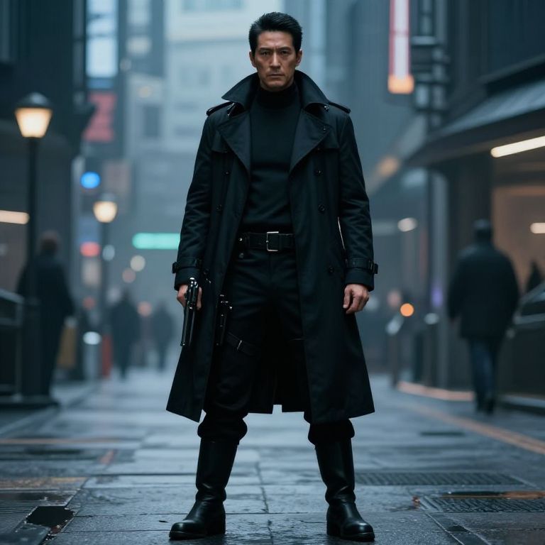 Bleeding futuristic street scene, immaculate middle-aged Japanese mercenary, trim short hair, black trenchcoat without a hood, high boots, gunslinger-style pistols strapped to left and right thighs,