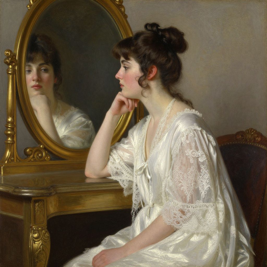 Photograph-style digital painting of a pensive woman with fair skin, dark hair in a bun, white lace dress, gazing at her reflection in