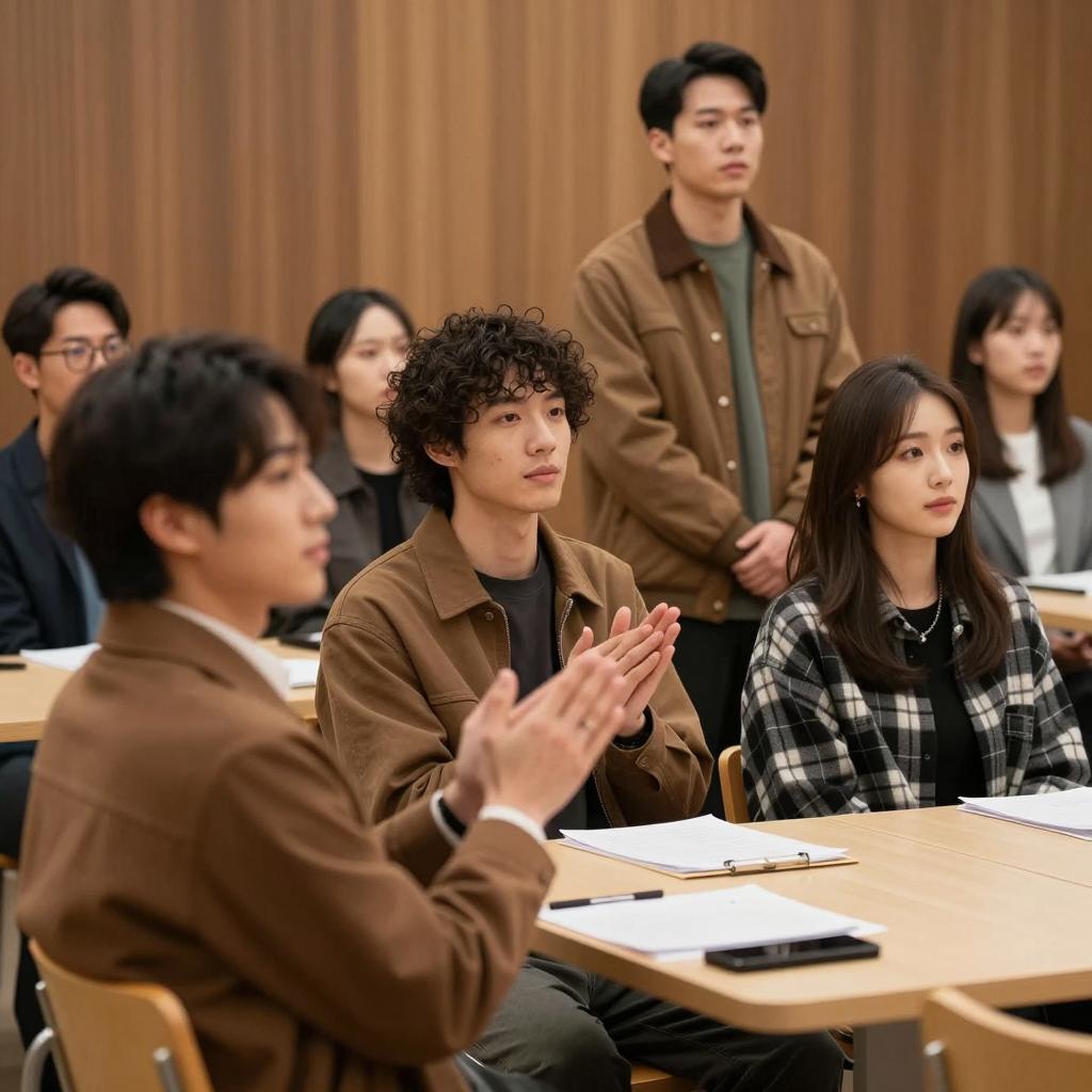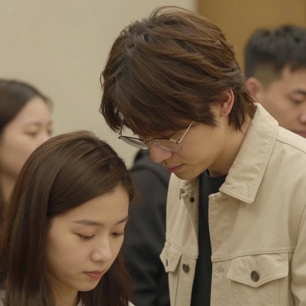 Photograph of two people. Young woman with brown hair, wearing a gray knit beanie with white patterns, black leather jacket. Man with dark curly hair, blue patterned shirt, necklace. Both focused on white object in foreground. Background includes blurred figures and purple wall sign. Man's expression is slightly open-mouthed, attentive. Woman's expression is focused.