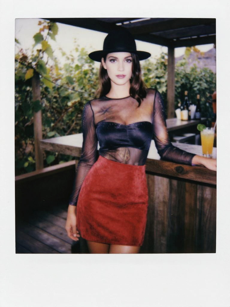 A tall woman in a contemporary bohemian style, wearing a translucent mesh top with cosmic and floral prints layered over a black bandeau, paired with a red faux suede A-line mini skirt. She accessorizes with a black felt fedora hat, standing at a cocktail bar vineyard terrace, captured in the visual style of a Polaroid instant camera. Sexy. Pretty face and beаutiful eyes. Big breasts