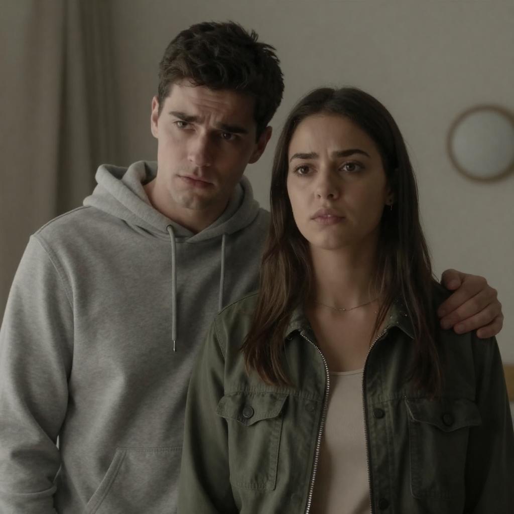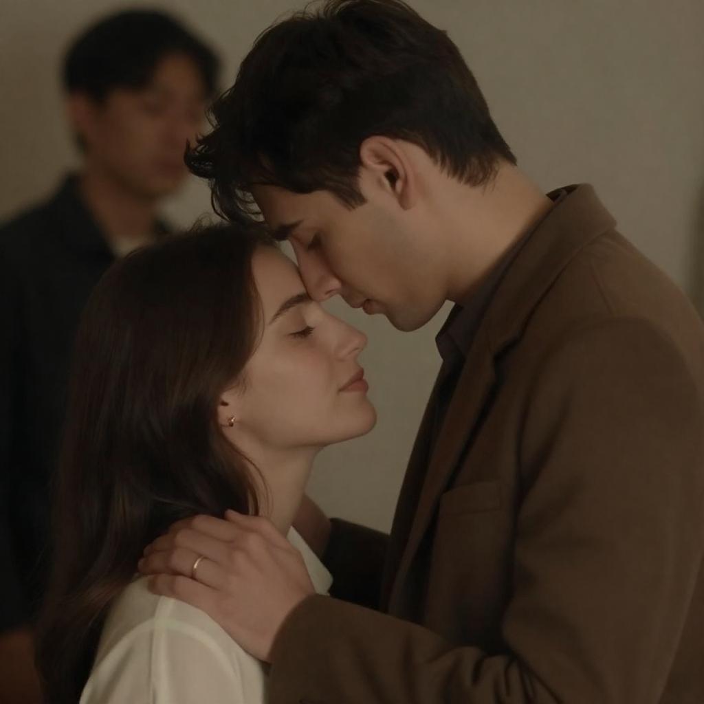 Photograph of three people indoors, featuring a woman with brown hair wearing a brown jacket gripping a man's face with both hands while giving an intense look. The man has dark hair, is bare-chested under a white jacket, and maintains a neutral expression. In the background, another woman with dark curly hair stands near a window showing a green lawn and a red building outside. The lighting is dim, creating a dramatic atmosphere.
