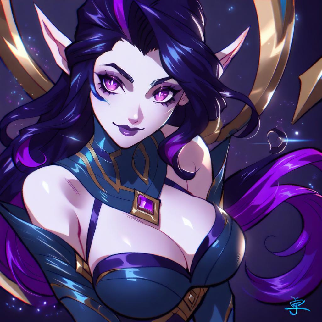 Morgana (league of legends), league of legends, 1girl, pointy ears, purple eyes, long hair, purple hair, black hair, large breasts, cleavage, bare shoulders, by artist shirako (kirupi), animagine