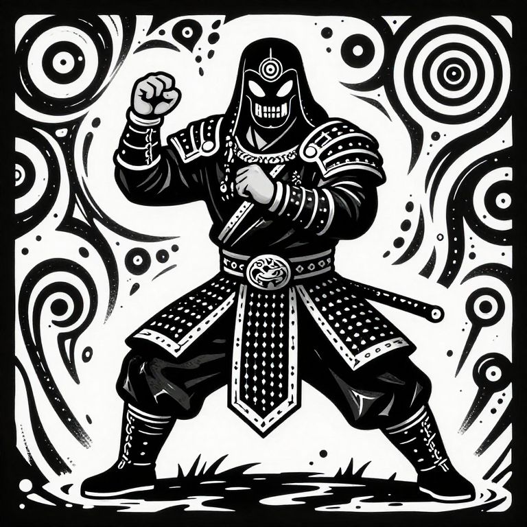 Chain Stitch martial combatant of the plains unarmed warrior of the fist in clothe armor. Black and white psychedelic spiritual horror pop art,