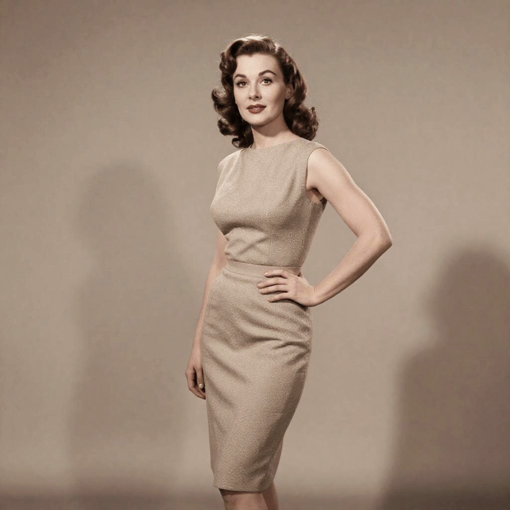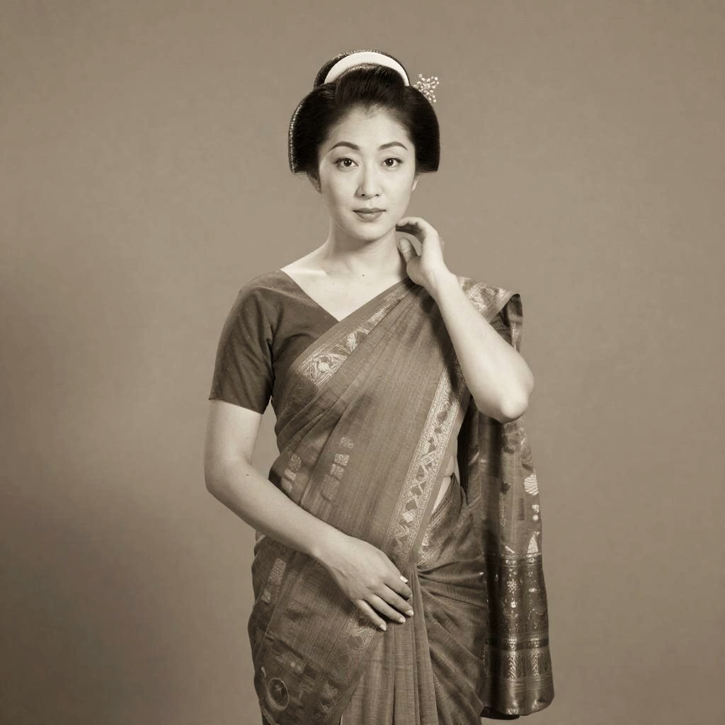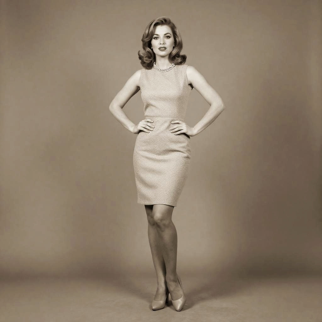 A Nigerian woman embodies the spirit of the 1980s in a regal seated portrait pose with hands gently clasped in lap, set against a muted sepia backdrop accented with a subtle Ankara textile motif that enhances her charm and nostalgic appeal.