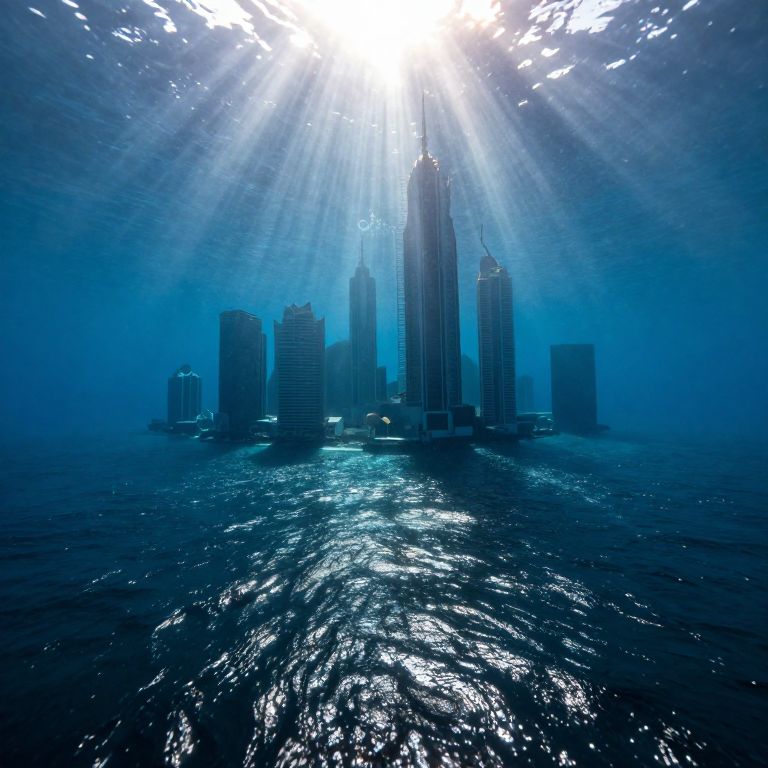 A sunlit ocean surface shimmers above a submerged metropolis, where towering skyscrapers rise from the depths, defying gravity as beams of sunlight pierce the water, casting an ethereal glow over this surreal underwater cityscape.