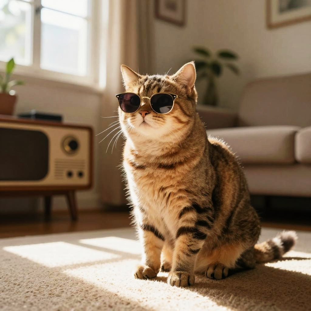 Cat twerk in a cozy living room, morning sunlight streaming through window, warm color palette, fluffy fur detailed with soft shading, playful and relaxed mood, retro vintage furniture, cat wearing tiny sunglasses, realistic textures, natural shadows.
