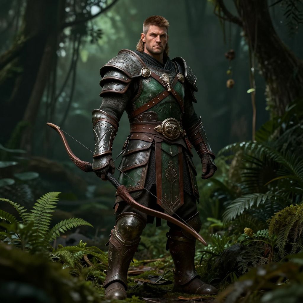 Ranger armor Conan Exiles, character standing tall in dark green and brown armor, intricate engravings, holding a bow, surrounded by dense jungle, realistic style, sharp details