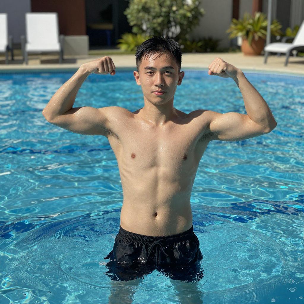Young Asian man with short black hair, muscular build, flexing arms in a blue pool, wearing black swim trunks, sunny outdoor setting.
