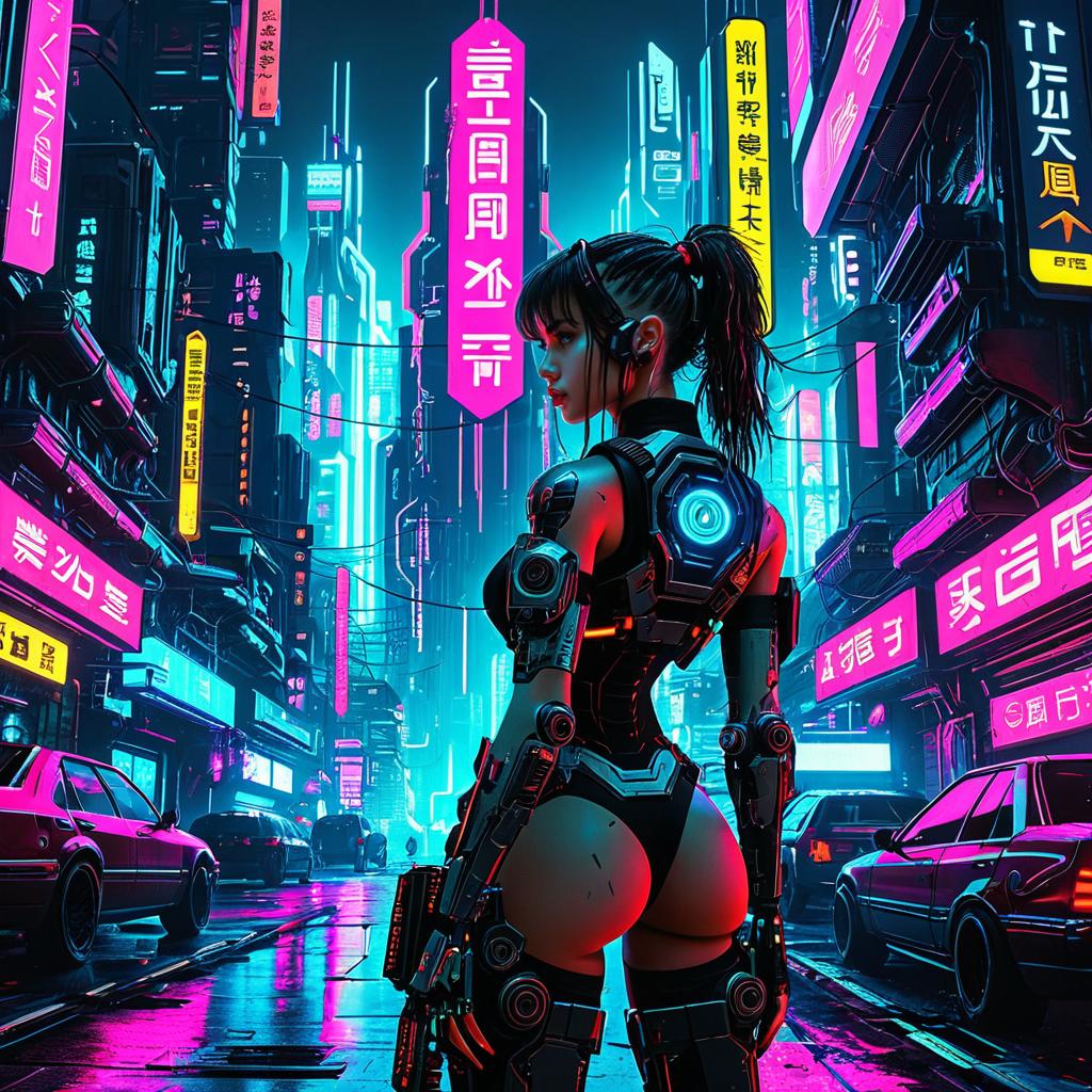 Cyberpunk cityscape: cybernetic woman with ponytail, glowing neon signs, futuristic cars, and vibrant pink, blue, and yellow lights