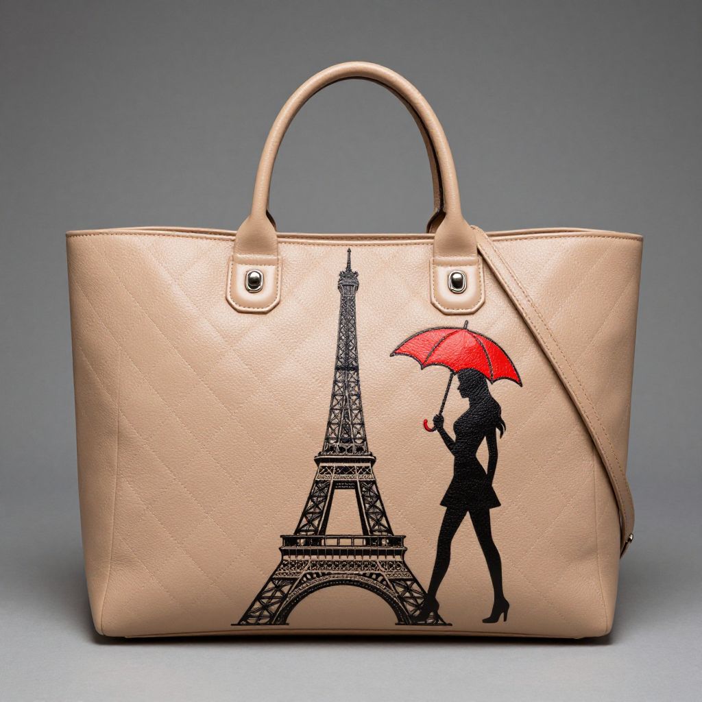 Camel-colored Chanel Caviar Leather Quilted Tote Bag featuring a detailed Eiffel Tower illustration and a silhouette of a woman holding a vibrant red umbrella, complemented by a crossbody strap and dual top handles.