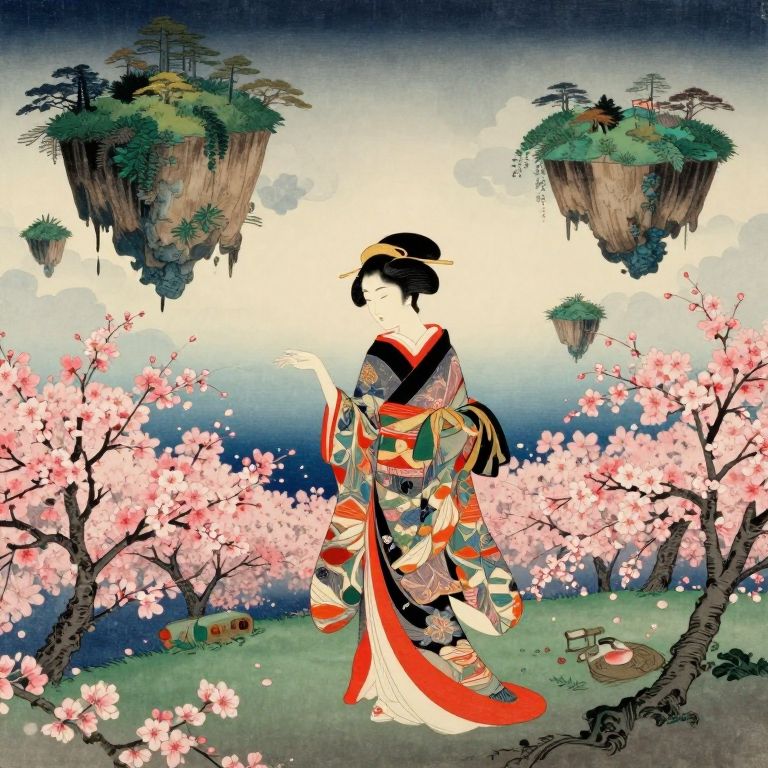 Elegant Japanese woman in colorful kimono, standing amid cherry blossoms, gazes at floating islands in a dreamy, surreal landscape. Digital art