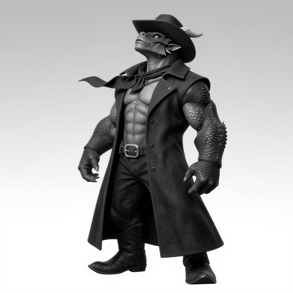 Male, soro, Anthro, demihuman, muscular, dragon, western dragon, dragon skin, tow horn, clothed, clothing, ((cowboy wear, neckerchief, fluttering neckerchief.swaying neckerchief, coat, coat hem, stretched coat, Draw neatly all the way to the hem, cowboy hat, gloves, cowboy boots)) realistic hands, 8k hd, extreme detail, extremely detailed, 2d clear, simple background, Full body image, High resolution, Binarization, side view, Wrinkles, open mouth, back of jaw, stand-up, arch one's back, fall back on your feet, look up at the sky