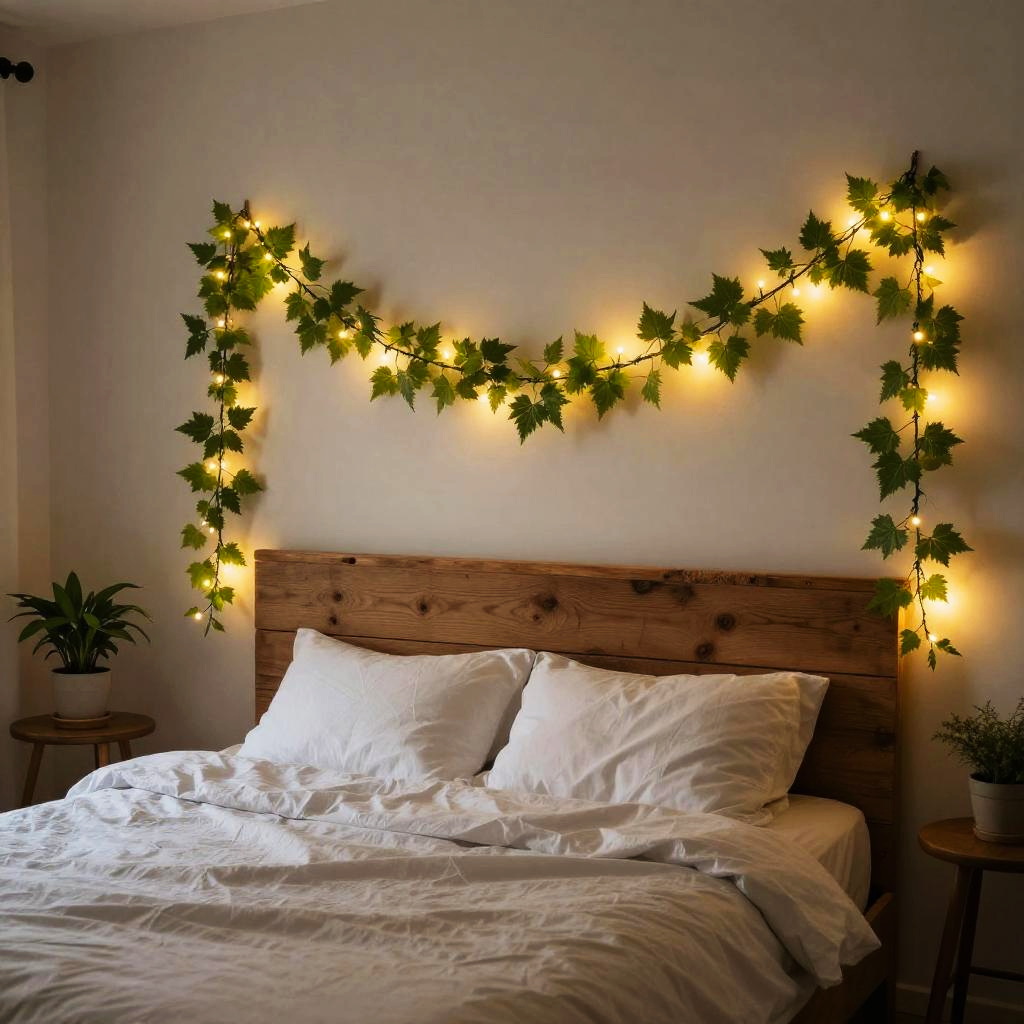Garland above bed, cozy bedroom scene with fairy lights intertwined in lush green vines, soft warm lighting, rustic wooden headboard, romantic and inviting atmosphere, photorealistic