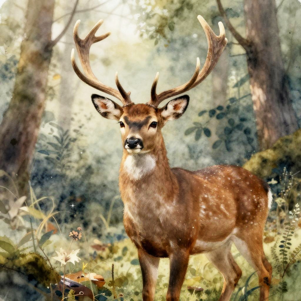 AI furry art generator producing an elegant anthropomorphic deer draped in natural forest elements, soft natural lighting filtering through trees, realistic fur texture, dreamy and serene composition, watercolor effect with delicate brushstrokes.