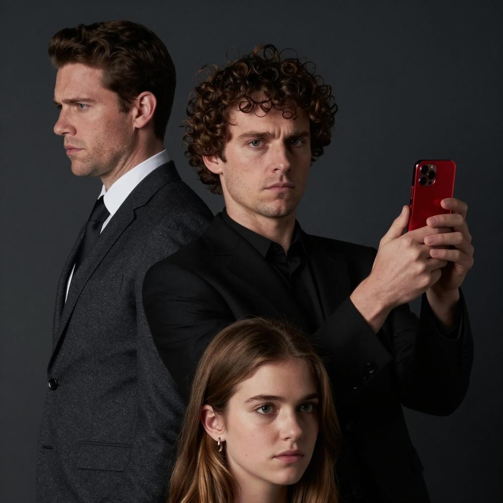 Portrait of a blonde woman with curly hair, red lipstick, and black clothing in a large close-up on the left. On the right, three men stand in a row against a white background: a bald man in a plaid shirt holding a red rose, a brown-haired man in a maroon t-shirt, and a blond man in a blue and white striped t-shirt pushing the man in front.