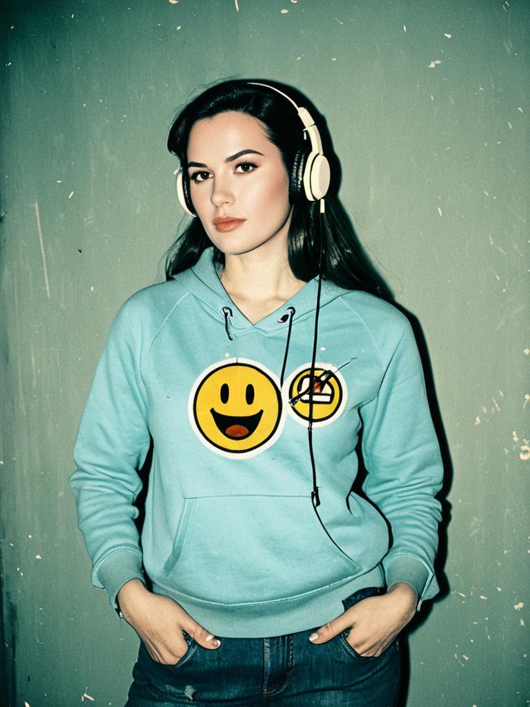 Woman Wearing Emoji Hoodie and Headphones