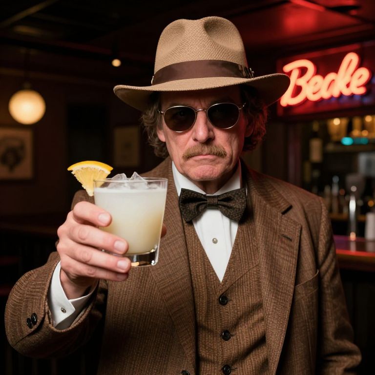 Photograph of a middle-aged man with curly brown hair, a mustache, and wearing dark sunglasses, a brown fedora, a brown textured three-piece suit, and a black bow tie. He holds a glass of a light-colored cocktail with a lemon slice garnish in his right hand, pointing it towards the camera. The background is a dimly lit bar with a red "Bar" neon sign and dark wooden decor. The man's expression is serious, and the overall scene has a vintage, retro style. The image is sharply focused with a slightly exaggerated, vibrant color filter.