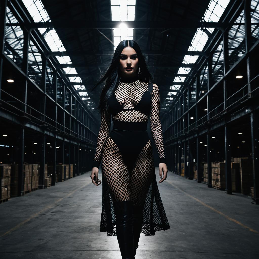 Model in Sheer Fishnet Gothic Dress in Abandoned Hangar