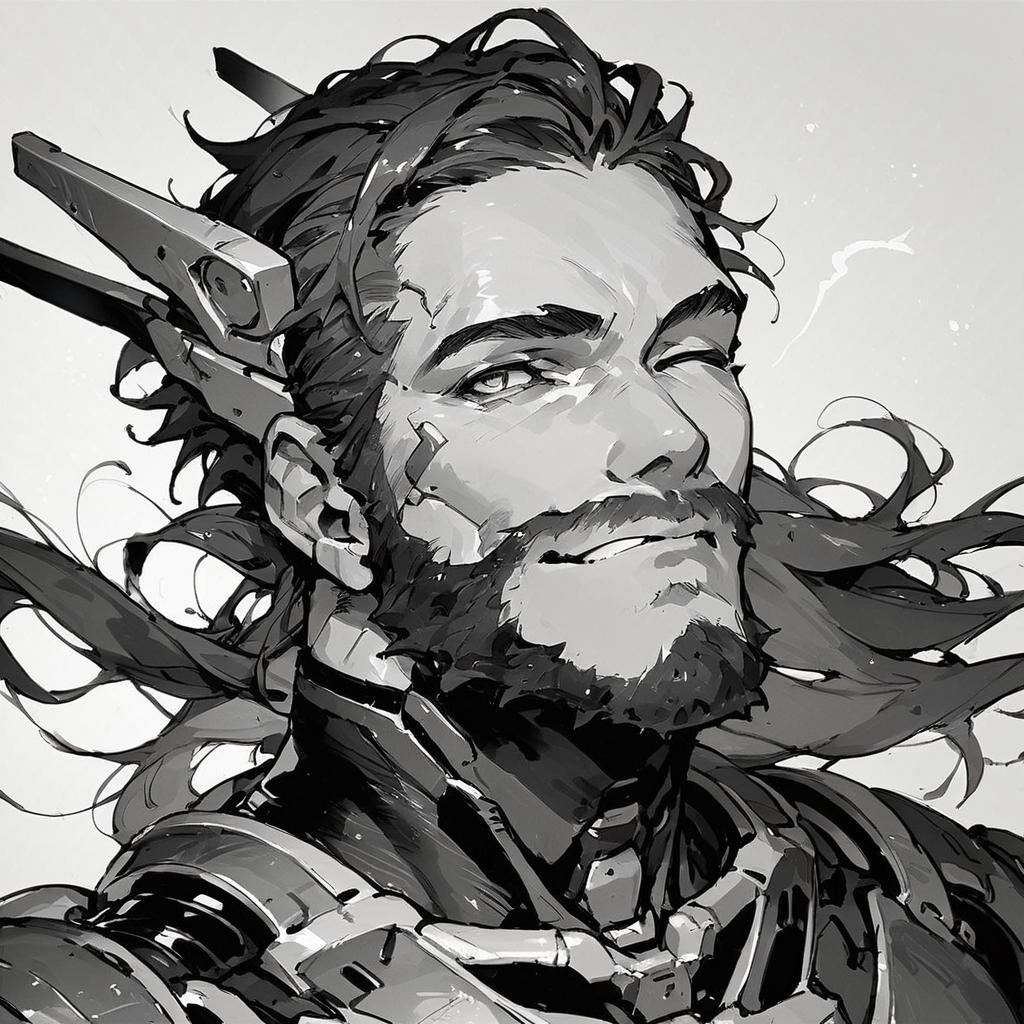 Score_9, score_8_up, score_7_up, source_ anime, traditional art, cyborg, bodysuit, headgear, beard, upper, monochrome, simple background, winking, smiling