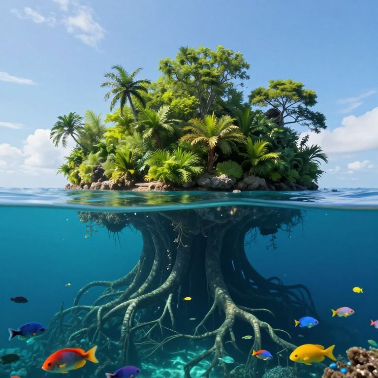 An enchanted island floats serenely on the ocean's surface, its lush greenery mirrored perfectly beneath the water, where schools of vibrant fish swim among the submerged roots, defying the boundaries between land and sea.