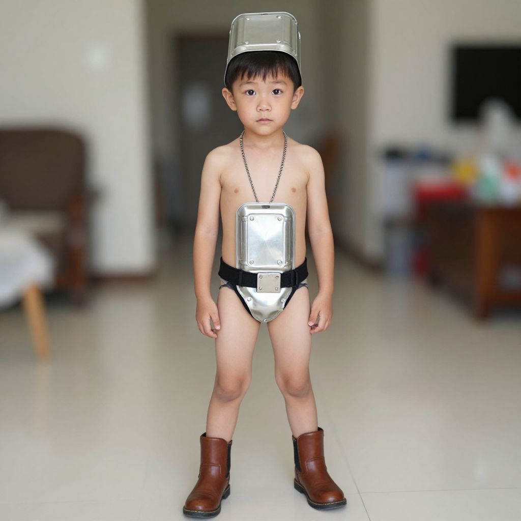 Photograph of a young Asian boy standing in a blurred indoor setting, wearing a silver helmet, metallic chest plate, black thong, and brown boots