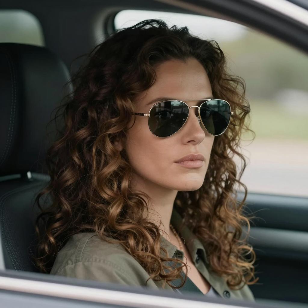 Split image: left, woman with short brown hair, wearing black sunglasses, green button-up blouse, talking on phone, outdoor setting; right, woman with curly blonde hair, wearing red sleeveless top with white star, brown sunglasses, smoking, driving car.