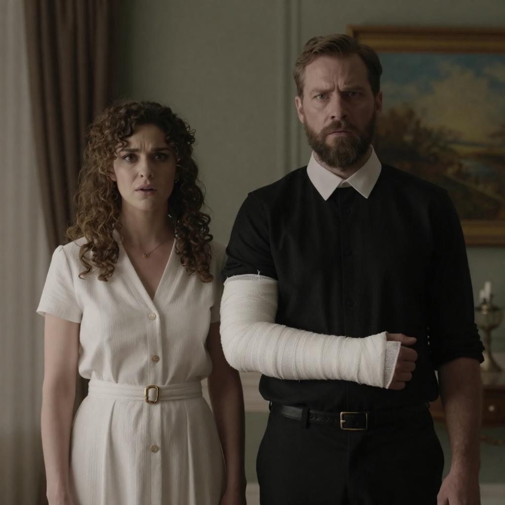 Photograph of a serious-looking man and woman standing side by side in an indoor setting. The woman, with curly brown hair, wears a white short-sleeve button-up dress with a belt, looking slightly to the side. The man has a beard and short brown hair, dressed in a black shirt with a white collar and black tie, with his right arm bandaged. The background shows a blurred painting and a curtain. The lighting is dim, creating a somber atmosphere. The man's expression is stern, while the woman's is more contemplative.