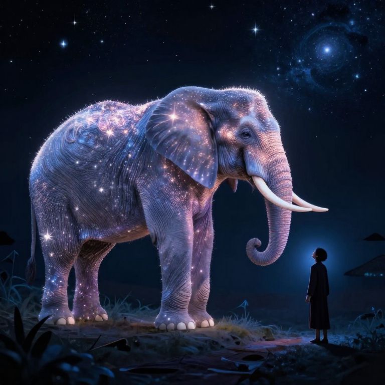 Digital artwork of a glowing, star-adorned elephant under a starry night sky, with a silhouette of a person standing in awe.