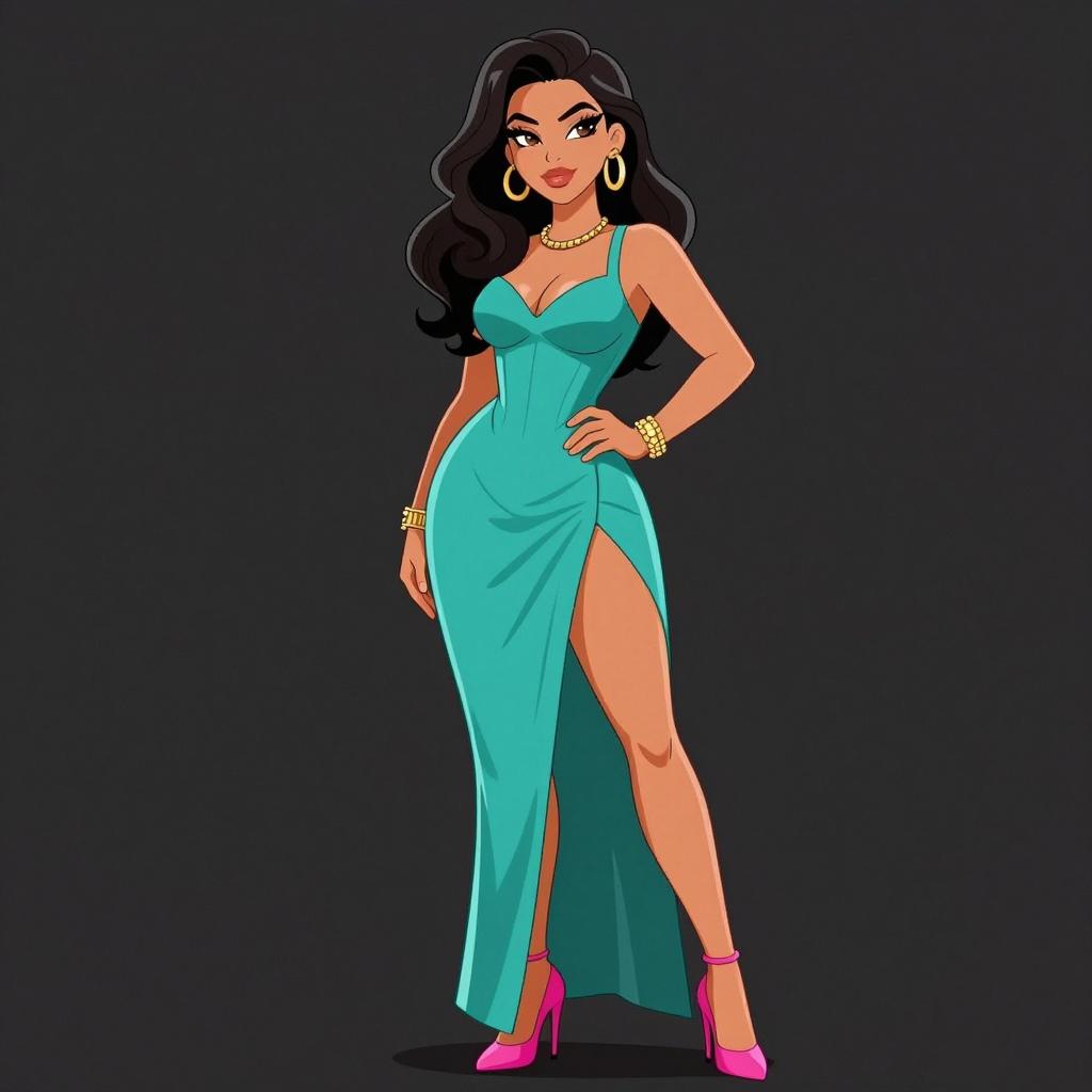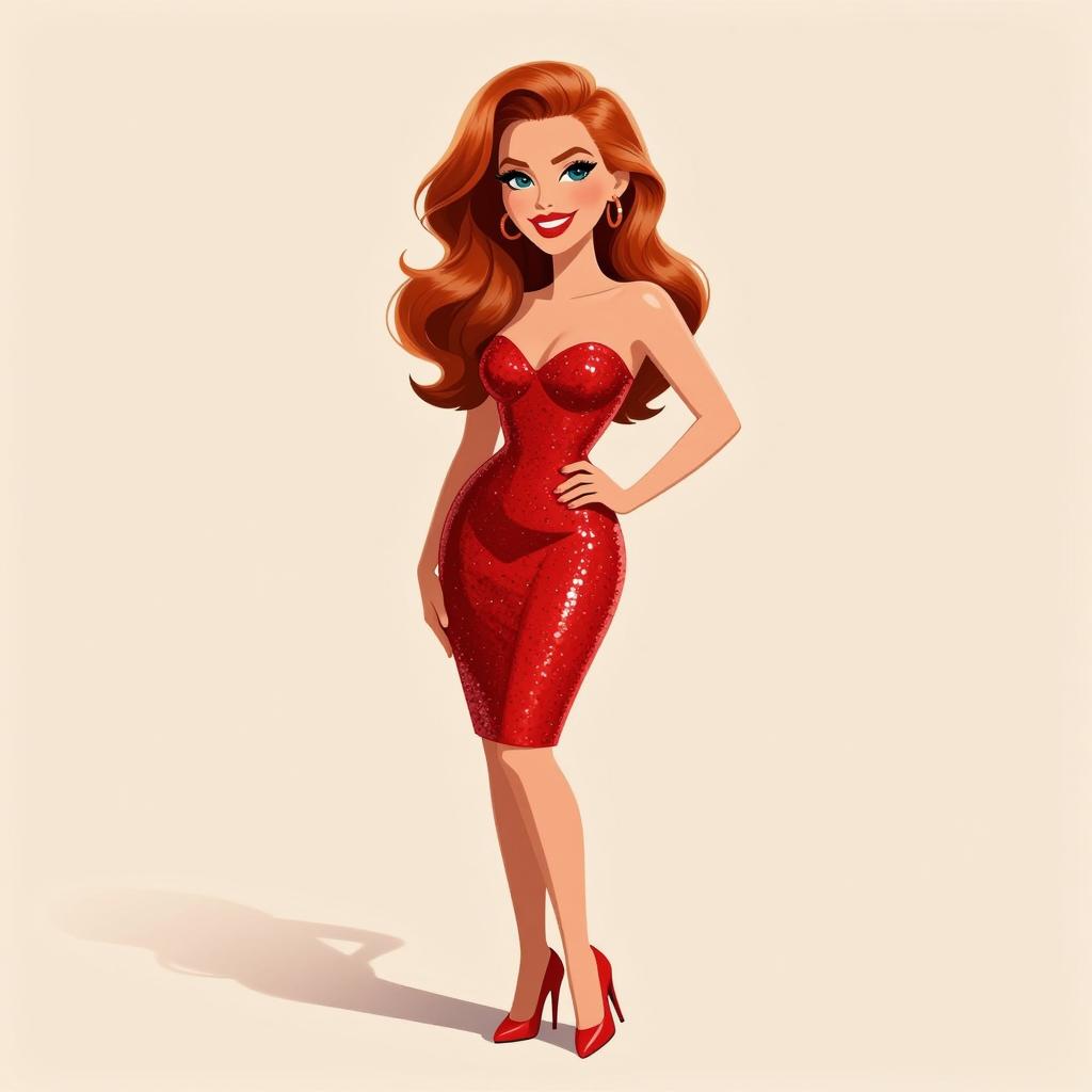 A glamorous caricature portrait of a woman with long red hair wearing a sparkling red strapless dress and red high heels, exaggerated facial features with a confident smile, standing pose with one hand on hip, smooth shading and vibrant warm tones, shiny highlights on dress, clean lines background with shadow on floor