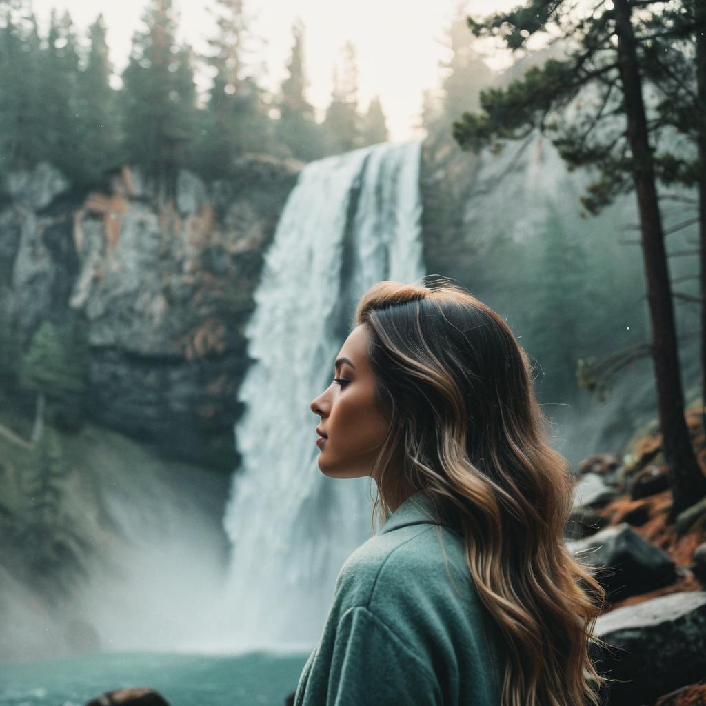 Side profile of a contemplative woman with long wavy hair wearing a soft teal jacket, standing near a misty waterfall surrounded by pine trees and rocky cliffs. The scene features muted, soft natural tones and a shallow depth of field, creating an ethereal and peaceful atmosphere in a forest setting.