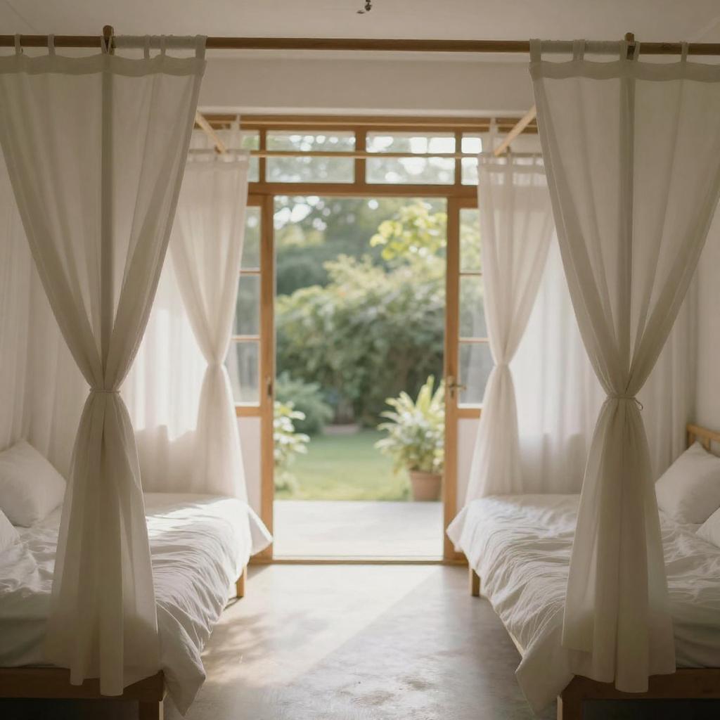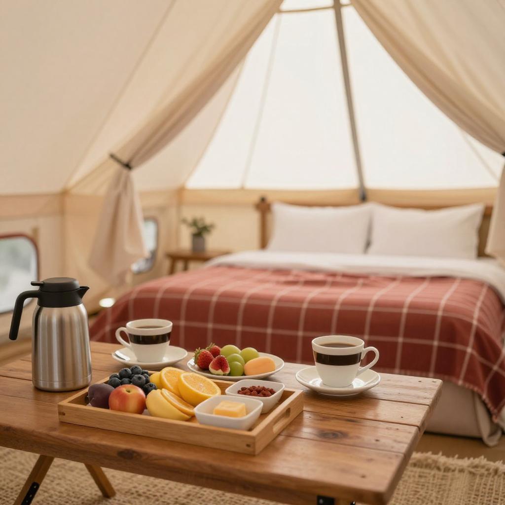 Photograph of a cozy, rustic tent bedroom with two white beds, each adorned with red and beige pillows and covers. The beds are under a white canopy. A wooden side table holds coffee mugs and a plate with fruit. Soft natural light filters in, creating a warm, inviting atmosphere. Camera angle is slightly above eye level, with a shallow depth of field, blurring the background.