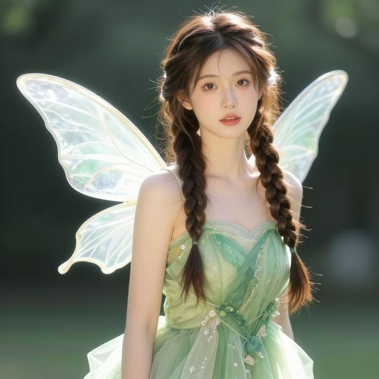 Female fairy with braids in her hair and a green dress with wings on her shoulders.