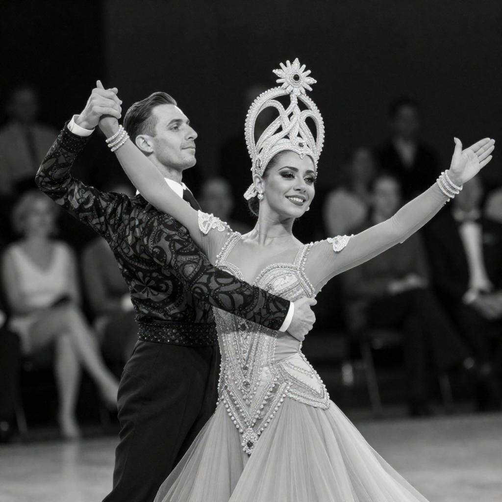 Black and white photograph of a dance performance. A woman in a detailed, flowing dress with long sleeves dances in the foreground. Audience seated at tables with floral dresses, smiling, watching. Patterned tapestry and columns in the background.