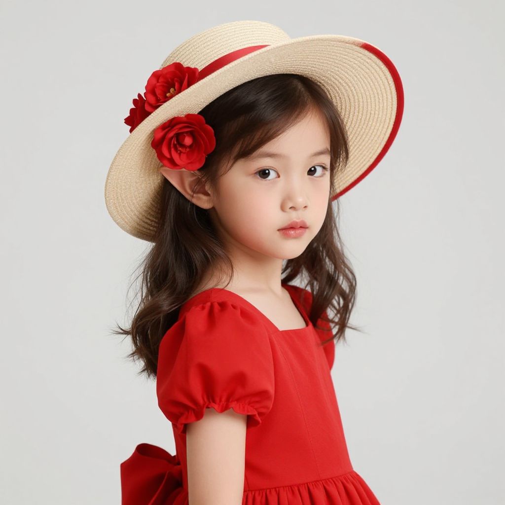 Promising young girl fancy, 1girl, solo, dress, realistic, flower, hair flower, hair ornament, hat, red dress, brown hair, child, pointy ears, lips
