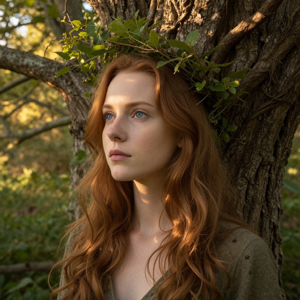 Photograph of a fair-skinned, red-haired woman with wavy hair, wearing a green leaf crown, standing against a sunlit tree in a