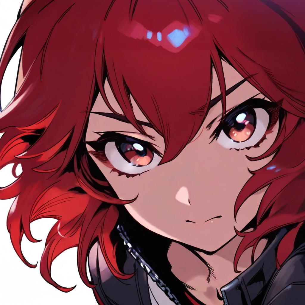 Close-up digital illustration of an anime-style girl with short wavy red hair and large brown eyes. The character has a calm expression and is wearing a dark-colored outfit with a chain detail. The artwork is inspired by anime and manga styles, specifically related to the Idolmaster series and artist Phantom IX Row.
