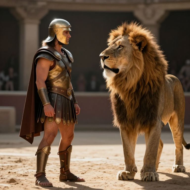 A gladiator stands in the arena, facing a lion with a long, flowing mane, both figures captured in a dramatic, cinematic light.