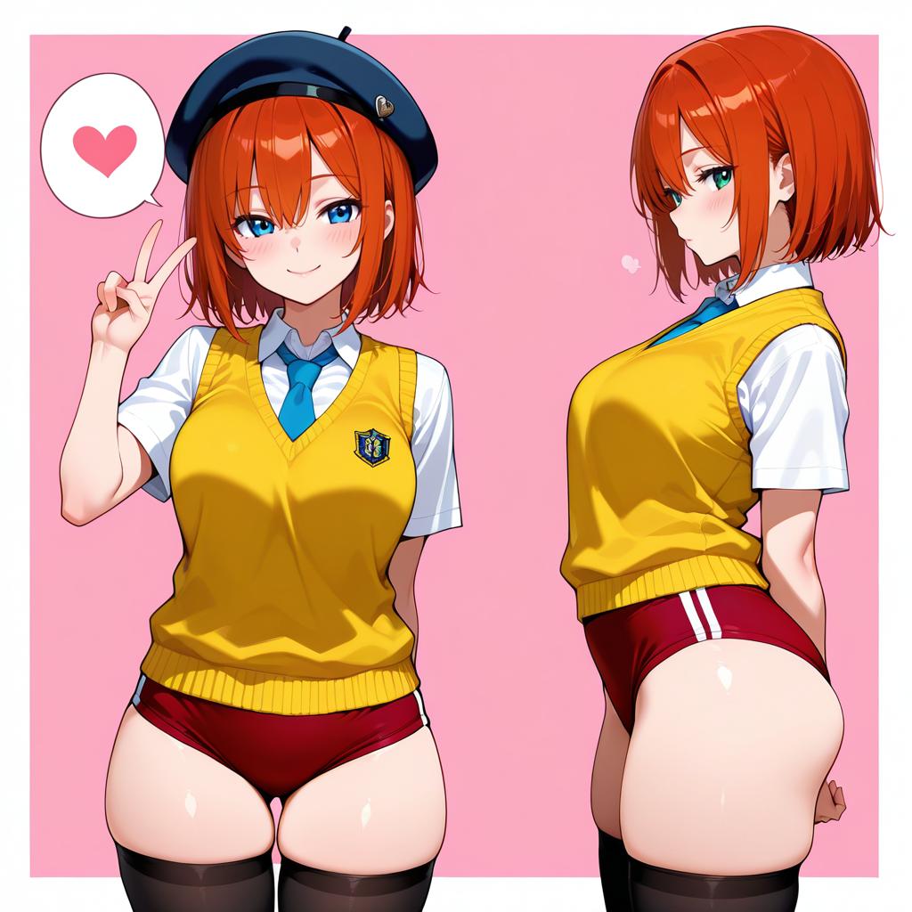 Masterpiece, best quality, high resolution, 1girl, solo, thighhighs, heart, spoken heart, smile, shirt, looking at viewer, short sleeves, buruma, necktie, v, blush, white shirt, yellow vest, collared shirt, black thighhighs, blue necktie, thighs, red buruma, sweater vest, beret, closed mouth, bangs, arm behind back, pink background, hand up, simple background, red shorts, cowboy shot, school uniform, hair between eyes, speech bubble, border