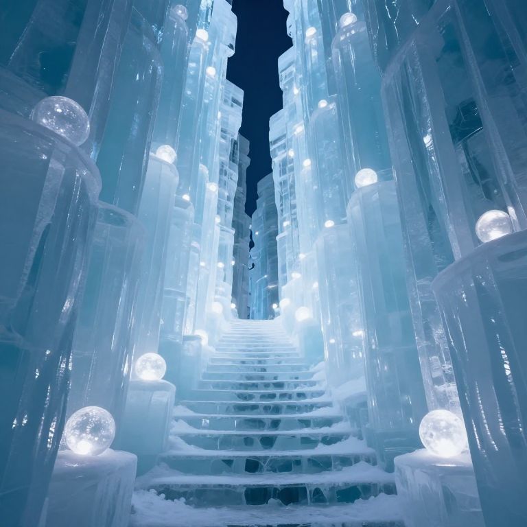 Photograph of an icy, illuminated staircase with glowing orbs, surrounded by towering, translucent ice structures, creating a surreal, ethereal winter scene.