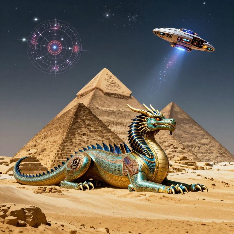 A vibrant CGI image depicts a colorful, dragon-like creature with blue, green, and gold scales, adorned with intricate patterns, lying in a sandy desert. In the background, two ancient Egyptian pyramids rise against a starry night sky. A futuristic, glowing blue spaceship hovers above, emitting a bright beam. A circular, celestial symbol floats in the top left corner. The scene blends ancient and futuristic elements, with the dragon and pyramids evoking an otherworldly, sci-fi fantasy setting. The desert sand is textured, with small rocks scattered around.